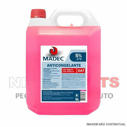 Anticongelante Madec 5%, -2ºC. - USO DIRETO Capacidade: 5L Rosa Protege contra: CONGELAÇÃO - SOBREAQUECIMENTO - CORROSÃO AC 5% é um fluido refrigerante e anticongelante, pré diluído, de uso direto, com excelentes propriedades de transferência térmica.